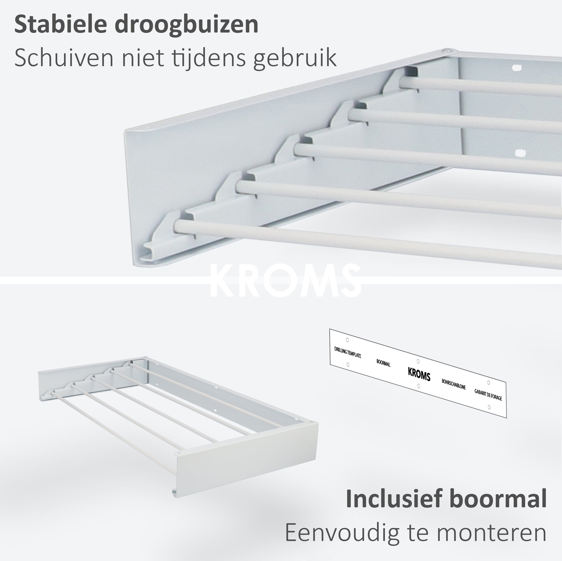Der wandmontierte Wäscheständer KROMS ist dank seiner Aluminiumkonstruktion extrem robust und langlebig, da er sich nicht verbiegt. Die stabilen Aluminiumstangen tragen bis zu 35 kg! Sie reduzieren außerdem Ihren CO₂-Fußabdruck, da Sie keinen Wäschetrockner mehr benötigen. Für eine optimale Lebensdauer empfehlen wir die Verwendung des Wäscheständers nur in Innenräumen.
