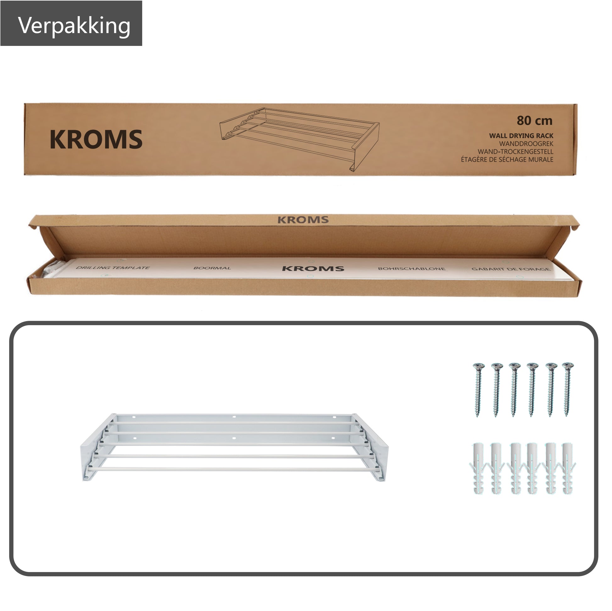Der wandmontierte Wäscheständer KROMS Vollweiß Neu auf dem Markt und eine verbesserte Version! Statt eines silbernen Aluminiumrahmens ist der gesamte Gepäckträger weiß (innen wie außen). Die Stahlrohre sitzen nun fest im Rahmen, sobald der Gepäckträger ausgeklappt ist. Dadurch ist er stabil und einfach zu bedienen. Nicht verschieben wenn du die Wäsche aufhängst.